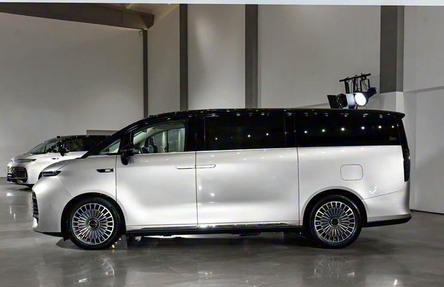 再来看车身侧面部分,车身侧面延续了“游艇姿态”的饱满轮廓,悬浮式车顶、电动侧滑门和20英寸密辐轮毂共同营造出豪华商务感。 尺寸方面,新车长宽高分别为5360/1998/1940mm,轴距达3200mm,全面超越同级竞品。 双色车身和纯平地板设计进一步提升了空间利用率,垂向高度达3米,为乘客提供舒展的乘坐体验。 隐藏式车门外拉手和电动踏板等细节,则强化了整车的科技感和便利性。