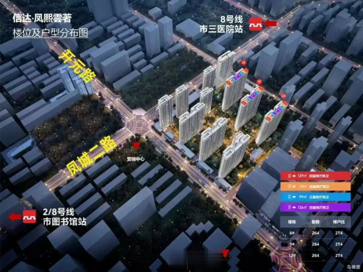 信达凤熙雲著项目位于北二环市图书板块,凤城二路与开元路交会处东南角。项目向西200米为2号线市图书馆站,向东300米为8号线市第三医院站;周边还有万达广场、大明宫遗址公园、四海唐人街、经开六小(原西安外国语学校)等成熟配套。