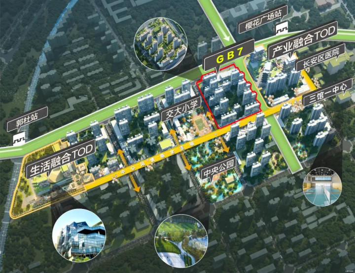 项目处于地铁15号线双地铁口(樱花广场站和郭杜站),距离樱花广场站仅200米。50亩中央公园 、樱花广场 、 郭杜森林公园环绕,与西安交大教育集团签约西安长安区第十五小学,佳龙EMC城市广场、CCworld樱山下、万科城市生活广场、宜家荟聚商业聚集。